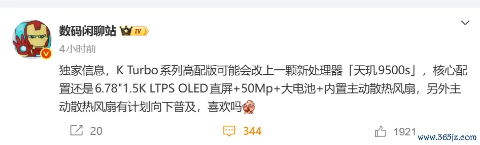 凭证爆料,OPPO K15 Turbo Pro的惩办器更换为了天玑9500s,又是一个新惩办器,估计此惩办器为天玑9400+的升级版,不知谈和天玑9500e是不是一个。
